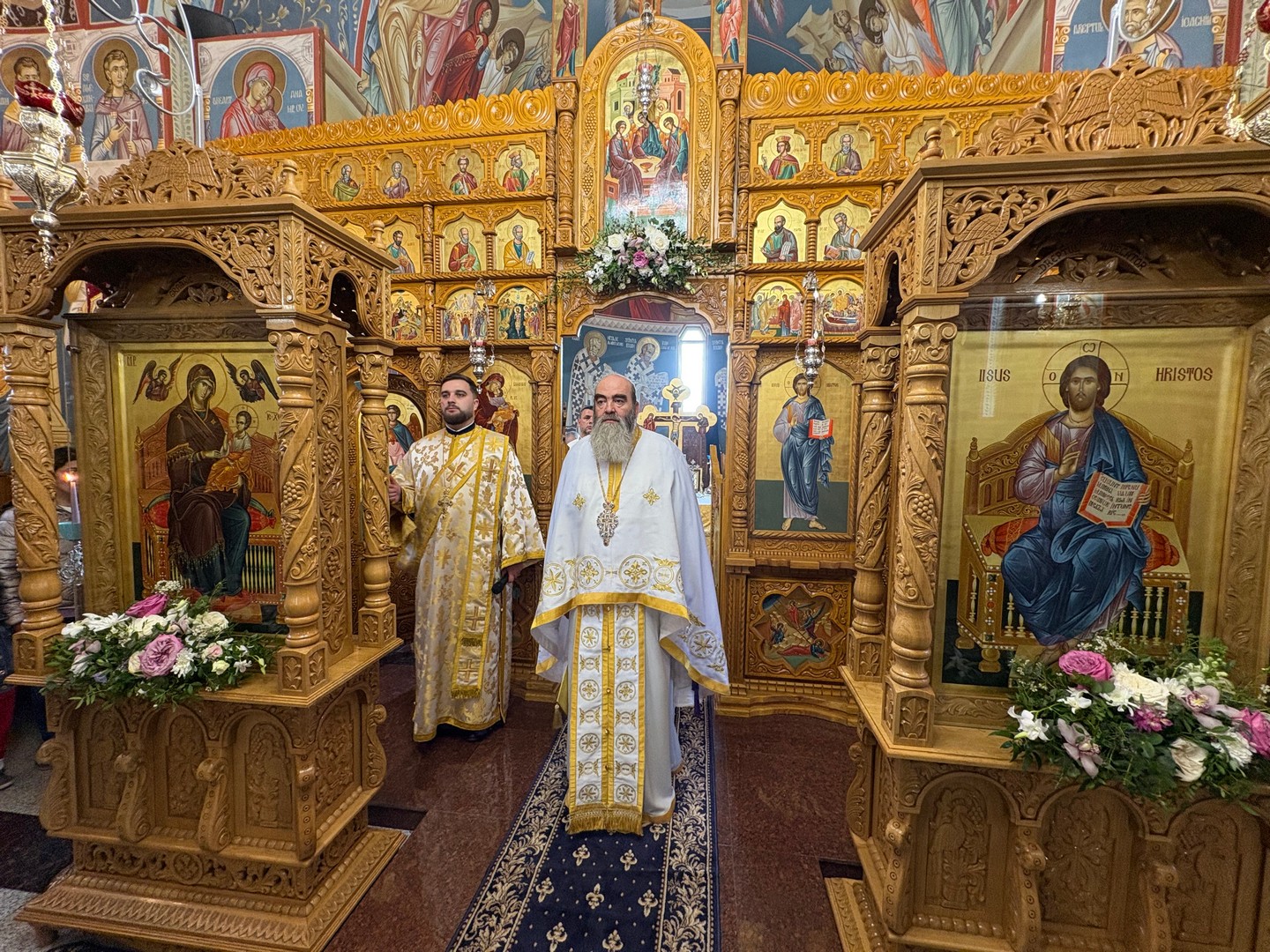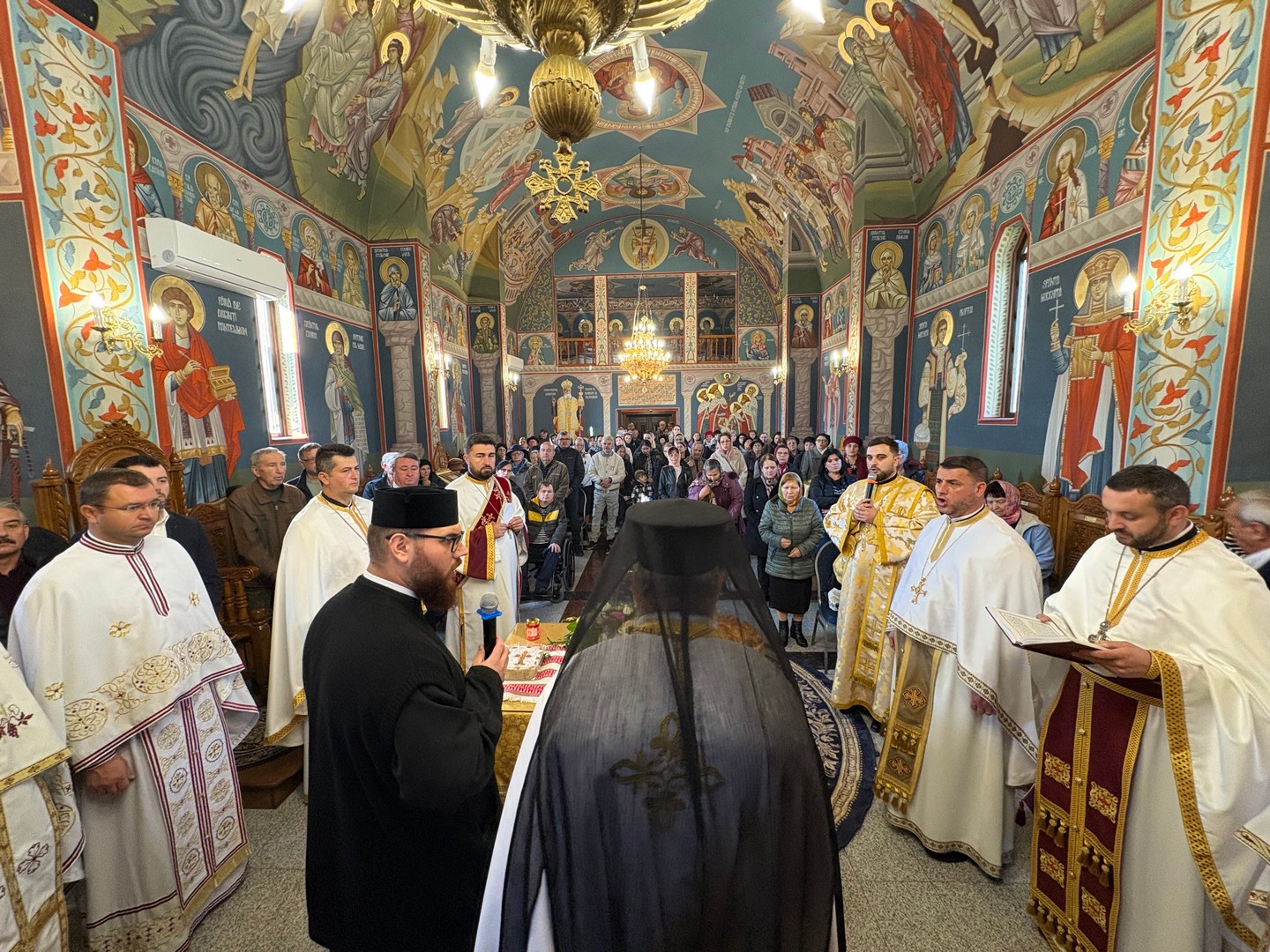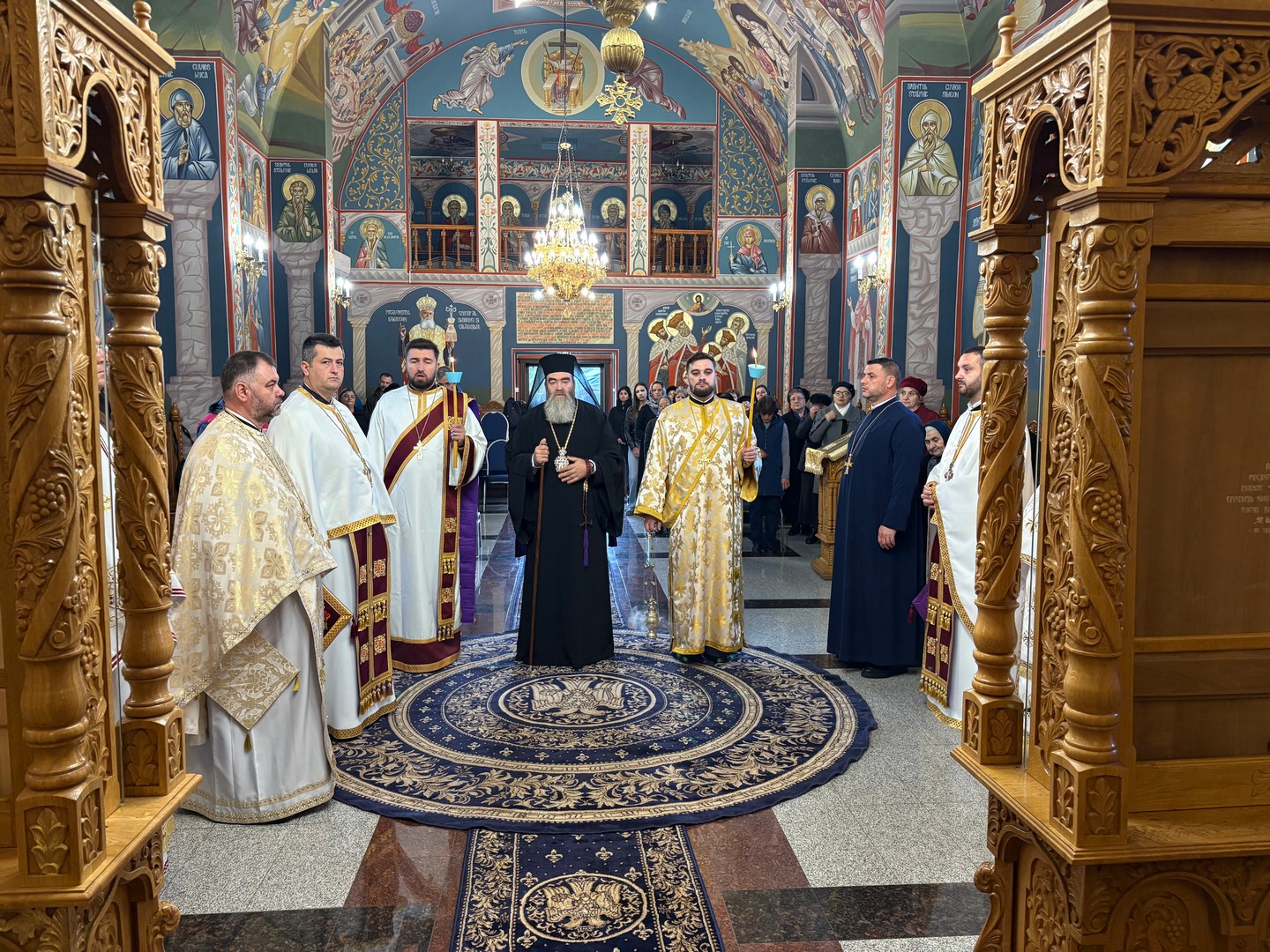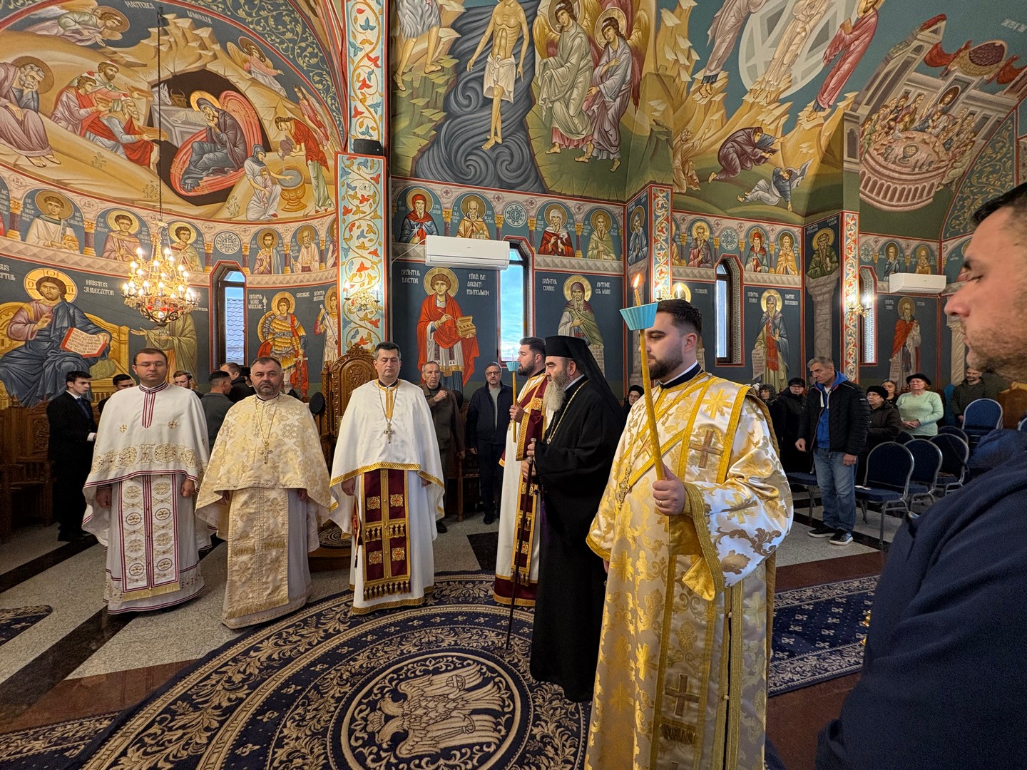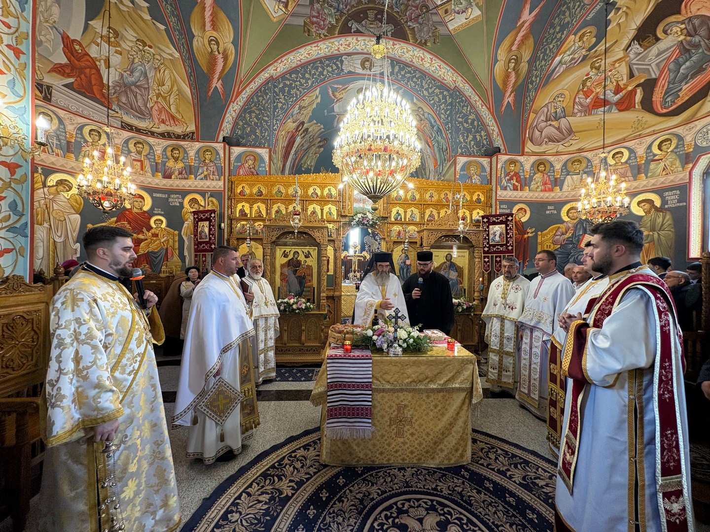 Sfânta Liturghie a fost oficiată de preacuviosul părinte Arhimandrit Rafail, vicar eparhial, înconjurat de un sobor de preoți și arhidiaconi.