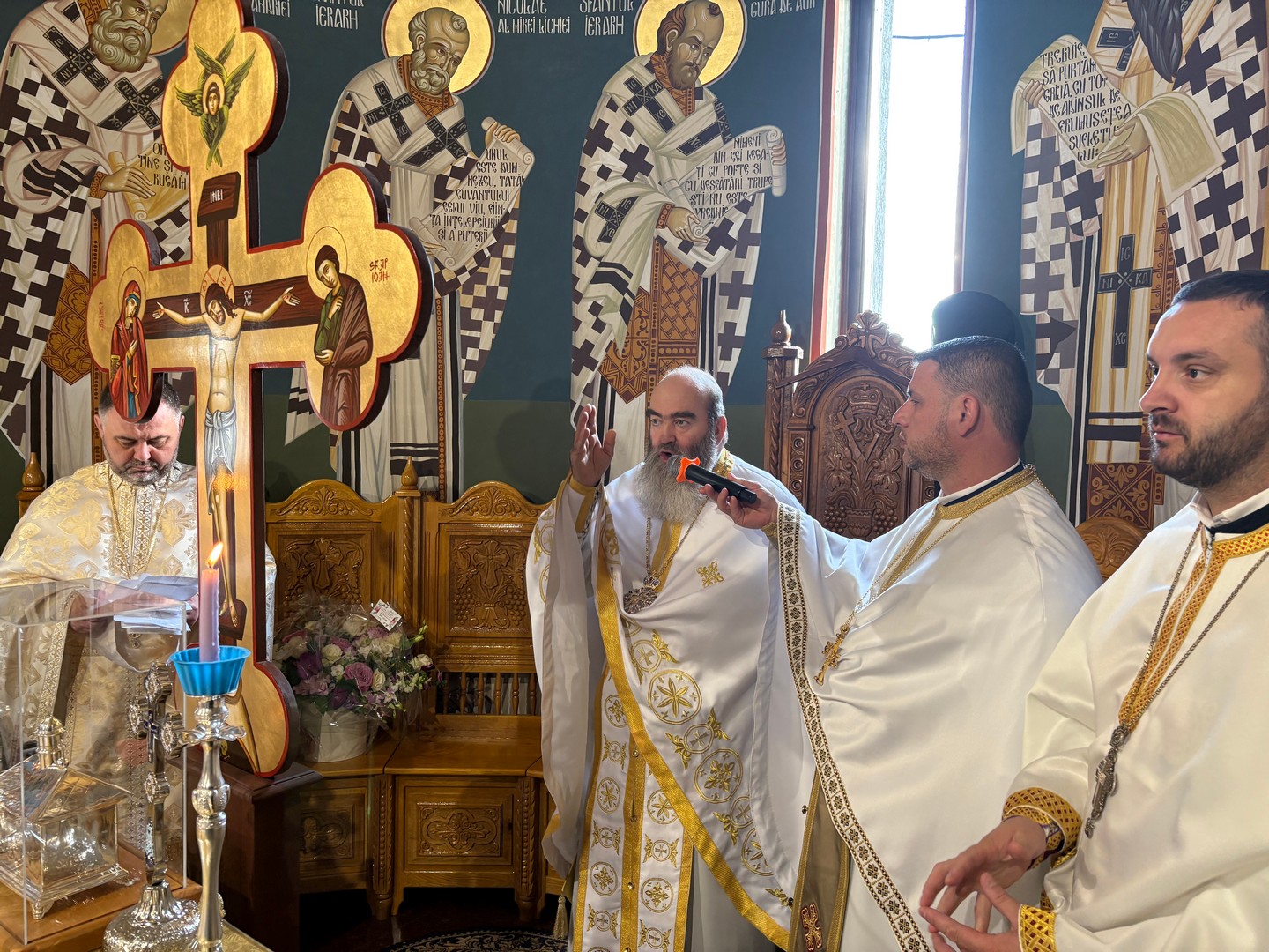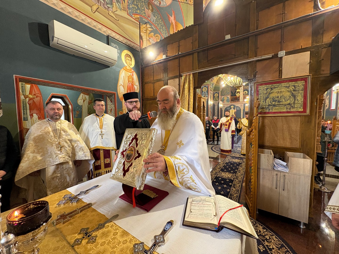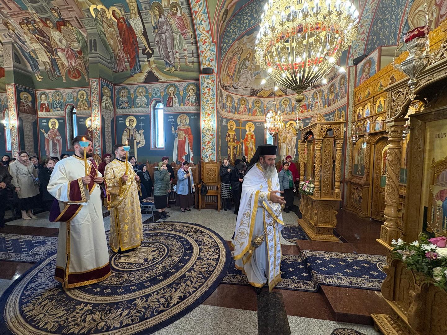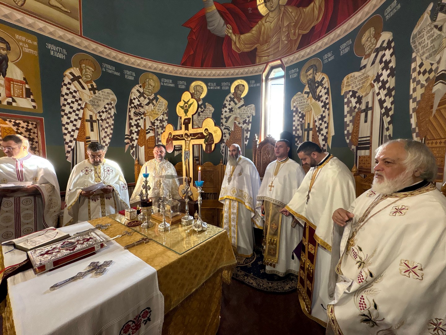 Sfânta Liturghie a fost oficiată de preacuviosul părinte Arhimandrit Rafail, vicar eparhial, înconjurat de un sobor de preoți și arhidiaconi.